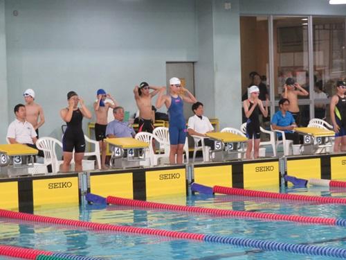 飛び込み台から水面に集中し、力の限り泳ぎます。